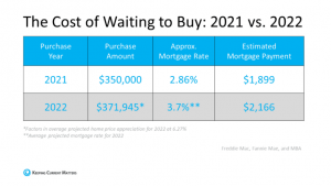 Using the average of the three projections (6.27%), a home that sells for $350,000 today would be valued at $371,945 by the end of next year. That means, if you delay, it could cost you more. As a prospective buyer, you could pay an additional $21,945 if you wait.